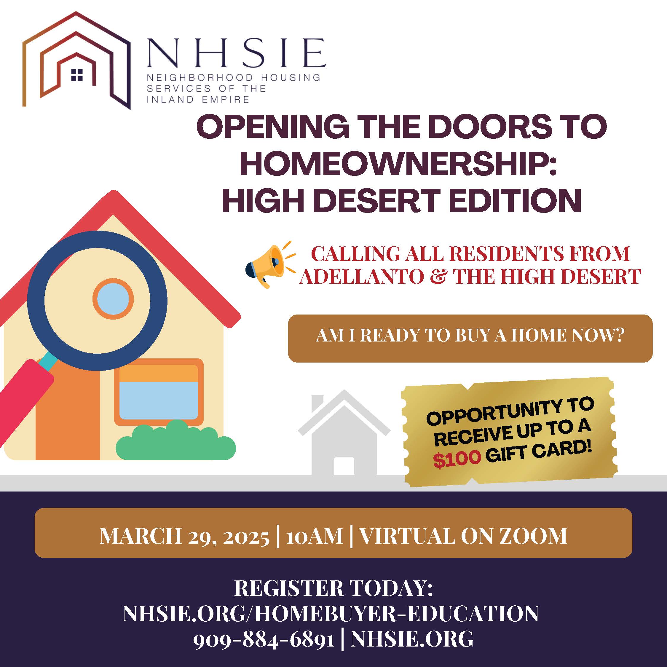 This edition of our Opening the Doors to Homeownership class is tailored for those currently living in Adelanto and the High Desert area. Others are welcome to join, but may not be eligible to receive giveaways.